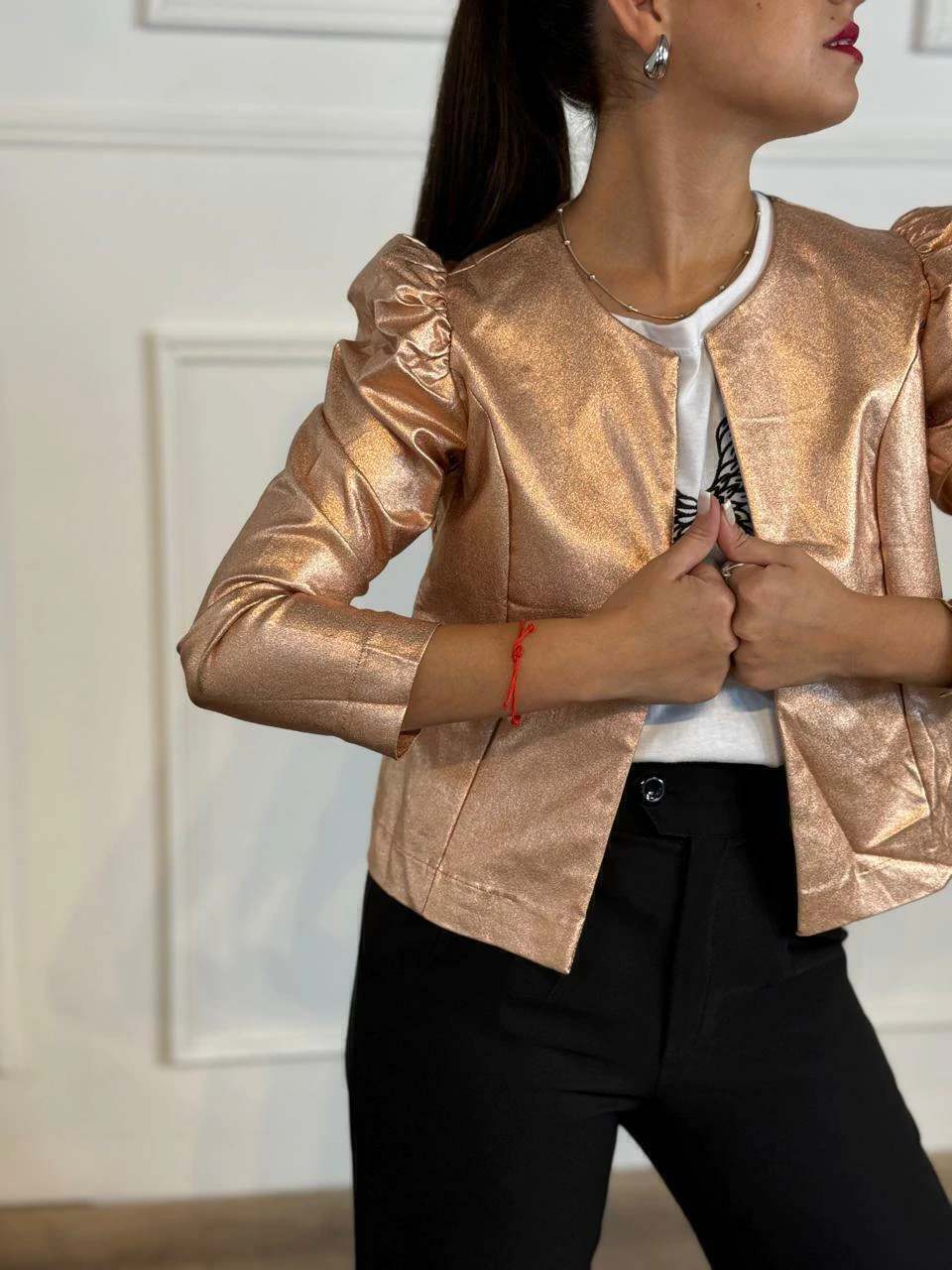 Descubri la chaqueta Cher Night, una prenda que redefine la elegancia y la comodidad. Esta chaqueta de ecocuero metalizada con manga princesa perfecto para quienes buscan un look distintivo y elegante.