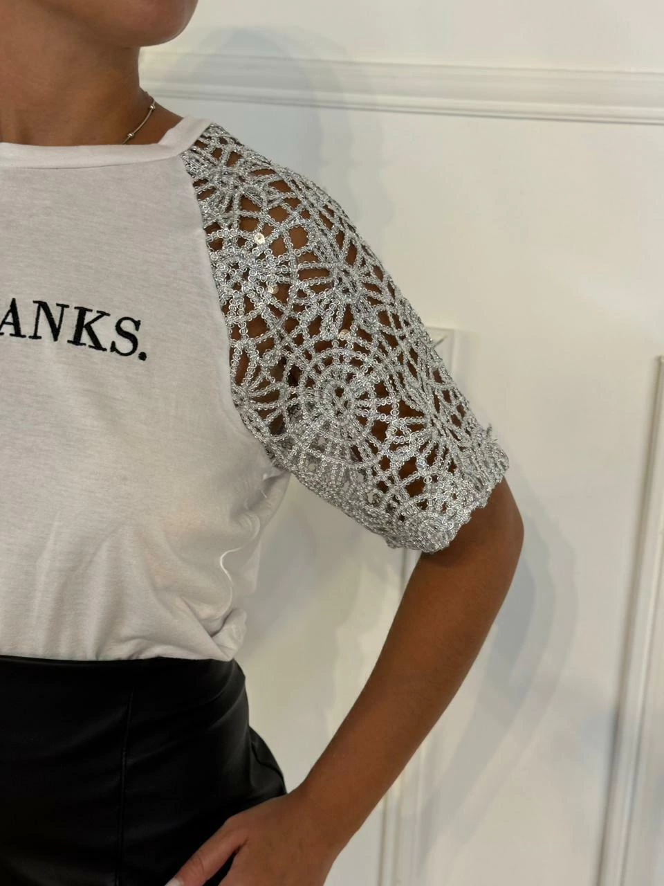 Descubri la Remera NoThanks., una remera de algodon con Estampa y mangas en pailette calado.